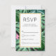 Une simple carte de réponse de mariage avec un fond peint représentant des feuilles tropicales peintes en vert. Un cadre blanc superposé avec une bordure en faux or.