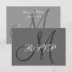 Un design simple et moderne de carte de réponse RSVP de mariage avec l'initiale de votre nom de famille en gris et blanc, ce qui en fait une réponse RSVP de mariage simple et polyvalente, car votre initiale créera votre propre design unique avec votre choix de couleurs pour le texte et l'arrière-plan. Conception d'Elke Clarke ©2008. Personnalisez avec votre monogramme et vos couleurs de mariage. Ajoutez tout votre texte de réponse RSVP de mariage au verso de la carte en utilisant les invites de menu faciles à utiliser de Zazzle. Fourni avec une enveloppe blanche vierge. Pour les accessoires assortis, voir les liens ci-dessous.