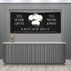 Restaurant Schwarz-weißer Koch Hat Covid Wiedereröffnung Banner. Ja, wir sind offen Restaurant wieder öffnen Banner. Dieses Design hat ein einfaches Logo für den Koch. Ideal für Restaurants, Catering oder Bäckereien!