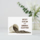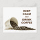 Photographie d'une tasse avec des grains de café brun sur un arrière - plan blanc avec le texte Gardez le calme et Buvez du café dessus.
