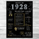Cette affiche numérique de 1928 est remplie de faits amusants, d'informations et de faits saillants de ce qui s'est passé il y a des années. Avec ses accents faux or et argent sur un arrière - plan noir, ses icônes distinctives et sa typographie audacieuse, l'affiche numérique dégage un look intemporel et élégant. Il sert de pièce de conversation mémorable lors de fêtes d'anniversaire et d'anniversaires, et lorsqu'il est encadré, il devient un cadeau de conservation réfléchi, ajoutant une touche de nostalgie à tout espace. Dégustez votre bien-aimé avec notre affiche imprimable Back en 1928, un cadeau mémorable qui déborde de nostalgie et d'individualité. Plein de détails captivants, il offre un voyage personnalisé à travers l'histoire, ce qui en fait une sélection idéale pour marquer une occasion d'anniversaire chère. La photo est une affiche imprimable pour l'année 1928 qui comprend des informations telles que le revenu moyen par an, les noms de bébés populaires, des événements historiques comme le 18ème Amendement et le krach du marché Stock, les inventions de l'époque, les tendances de la mode comme les robes de Flapper et les Casquettes de Cloche, les termes d'argot, et le coût moyen d'articles comme une livre de pain et un gallon de gaz.