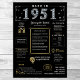 Entrez en 1951 avec notre affiche d'anniversaire numérique attrayante, remplie de faits historiques, d'événements importants et d'histoires intéressantes du passé. Décorée avec des détails dorés et argentés sur un arrière - plan noir audacieux, avec des symboles uniques et un texte élégant, cette affiche d'anniversaire a un charme intemporel. Qu'il s'agisse d'allumer des conversations lors de réunions d'anniversaire ou d'être gardé comme un gardien, il ramène des souvenirs nostalgiques. L'affiche d'anniversaire donne un aperçu de 1951, couvrant des sujets comme le revenu moyen, les inventions populaires, les événements importants, les tendances de la mode, et l'argot de l'époque. Il met en lumière des moments clés tels que la première émission de télévision couleur, le baby-boom d'après-guerre, l'essor du rock and roll, et l'invention du vaccin contre la polio. Des inventions notables comme le photocopieur, la batterie alcaline et la bombe à hydrogène sont également mentionnées, montrant les avancées technologiques de l'époque. Dans l'ensemble, l'affiche d'anniversaire saisit l'essence de la vie dans les années 1950, touchant à la technologie, aux frais de vie et aux tendances culturelles comme la musique et la mode. Il fait une pièce de conversation mémorable lors de fêtes d'anniversaire, anniversaires et un cadeau de souvenir réfléchi lorsqu'il est encadré.