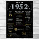 Entrez en 1952 avec notre affiche d'anniversaire numérique attrayante, remplie de faits historiques, d'événements importants et d'histoires intéressantes du passé. Décorée avec des détails dorés et argentés sur un arrière - plan noir audacieux, avec des symboles uniques et un texte élégant, cette affiche d'anniversaire a un charme intemporel. Qu'il s'agisse d'allumer des conversations lors de réunions d'anniversaire ou d'être gardé comme un gardien, il ramène des souvenirs nostalgiques. L'affiche d'anniversaire donne un aperçu de 1952, couvrant des sujets comme le revenu moyen, les inventions populaires, les événements importants, les tendances de la mode, et l'argot de l'époque. Il met en lumière des moments clés tels que la première émission de télévision couleur, le baby-boom d'après-guerre, l'essor du rock and roll, et l'invention du vaccin contre la polio. Des inventions notables comme le photocopieur, la batterie alcaline et la bombe à hydrogène sont également mentionnées, montrant les avancées technologiques de l'époque. Dans l'ensemble, l'affiche d'anniversaire saisit l'essence de la vie dans les années 1950, touchant à la technologie, aux frais de vie et aux tendances culturelles comme la musique et la mode. Il fait une pièce de conversation mémorable lors de fêtes d'anniversaire, anniversaires et un cadeau de souvenir réfléchi lorsqu'il est encadré.