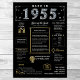 Entrez en 1955 avec notre affiche d'anniversaire numérique captivante, remplie de faits historiques, d'événements remarquables et d'histoires intrigantes du passé. Ornée d'élégants détails dorés et argentés contre un arrière - plan noir audacieux, avec des symboles uniques et un texte élégant, cette affiche d'anniversaire dégage un charme intemporel. Qu'il s'agisse d'allumer des conversations lors de réunions d'anniversaire ou de se faire chérir comme gardien, il évoque des souvenirs nostalgiques. Notre affiche d'anniversaire offre un aperçu de 1955, explorant des aspects comme le revenu moyen, les inventions populaires, les événements importants, les tendances de la mode et l'argot de l'époque. Il met en lumière des moments clés tels que la première émission de télévision couleur, le baby-boom d'après-guerre, l'essor du rock and roll et le développement du vaccin contre la polio. Des inventions notables comme le photocopieur, la batterie alcaline et la bombe à hydrogène sont également présentées, montrant les avancées technologiques de l'époque. Dans l'ensemble, l'affiche d'anniversaire saisit l'essence de la vie dans les années 1950, englobant la technologie, les frais de vie et les tendances culturelles comme la musique et la mode. Il sert de pièce de conversation mémorable lors de fêtes d'anniversaire et d'anniversaires et fait un souvenir réfléchi lorsqu'il est encadré.