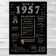 Entrez en 1957 avec notre affiche d'anniversaire numérique captivante, remplie de faits historiques, d'événements remarquables et d'histoires intrigantes du passé. Ornée d'élégants détails dorés et argentés contre un arrière - plan noir audacieux, avec des symboles uniques et un texte élégant, cette affiche d'anniversaire dégage un charme intemporel. Qu'il s'agisse d'allumer des conversations lors de réunions d'anniversaire ou de se faire chérir comme gardien, il évoque des souvenirs nostalgiques. Notre affiche d'anniversaire offre un aperçu de 1957, explorant des aspects comme le revenu moyen, les inventions populaires, les événements importants, les tendances de la mode et l'argot de l'époque. Il met en lumière des moments clés tels que la première émission de télévision couleur, le baby-boom d'après-guerre, l'essor du rock and roll et le développement du vaccin contre la polio. Des inventions notables comme le photocopieur, la batterie alcaline et la bombe à hydrogène sont également présentées, montrant les avancées technologiques de l'époque. Dans l'ensemble, l'affiche d'anniversaire saisit l'essence de la vie dans les années 1950, englobant la technologie, les frais de vie et les tendances culturelles comme la musique et la mode. Il sert de pièce de conversation mémorable lors de fêtes d'anniversaire et d'anniversaires et fait un souvenir réfléchi lorsqu'il est encadré.