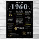 Entrez en 1960 avec notre affiche d'anniversaire numérique captivante, riche de faits historiques, d'événements remarquables et d'histoires intrigantes du passé. Décorée d'élégants détails dorés et argentés, collés à un audacieux arrière - plan noir, arborant des symboles uniques et un texte élégant, cette affiche d'anniversaire dégage un charme intemporel. Qu'il s'agisse d'allumer des conversations lors de réunions d'anniversaire ou de se faire chérir comme gardien, il évoque des souvenirs nostalgiques. Notre affiche d'anniversaire offre un aperçu de 1960, explorant des aspects tels que le revenu moyen, les inventions populaires, les événements importants, les tendances de la mode et l'argot de l'époque. Il met en lumière des moments clés tels que l'avènement de la première calculatrice portative, l'atterrissage de la Lune américaine, le mouvement pour les droits civiques et l'approbation de la pilule contraceptive. Des inventions remarquables, comme le premier laser, le stimulateur cardiaque et la valve cardiaque artificielle, sont également présentées, montrant les avancées technologiques de l'époque. Dans l'ensemble, l'affiche d'anniversaire reflète l'essence de la vie dans les années 1960, englobant la technologie, les frais de vie et les tendances culturelles comme la musique et la mode. Il sert de pièce de conversation mémorable lors de fêtes d'anniversaire et d'anniversaires et fait un souvenir réfléchi lorsqu'il est encadré.