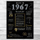 Revenez en 1967 avec notre affiche d'anniversaire numérique captivante, riche de faits historiques, d'événements marquants et d'histoires intrigantes du passé. Ornée d'élégants détails dorés et argentés contre un arrière - plan noir audacieux, avec des symboles uniques et un texte élégant, cette affiche d'anniversaire dégage un charme intemporel. Qu'il s'agisse d'allumer des conversations lors de réunions d'anniversaire ou de se faire chérir comme gardien, il évoque des souvenirs nostalgiques. Notre affiche d'anniversaire donne un aperçu de 1967, explorant des aspects tels que le revenu moyen, les inventions populaires, les événements importants, les tendances de la mode et l'argot de l'époque. Il met en lumière des moments clés tels que l'avènement de la première calculatrice portative, l'atterrissage de la Lune américaine, le mouvement pour les droits civiques et l'approbation de la pilule contraceptive. Des inventions remarquables, comme le premier laser, le stimulateur cardiaque et la valve cardiaque artificielle, sont également présentées, montrant les avancées technologiques de l'époque. Dans l'ensemble, l'affiche d'anniversaire reflète l'essence de la vie dans les années 1960, englobant la technologie, les frais de vie et les tendances culturelles comme la musique et la mode. Il sert de pièce de conversation mémorable lors de fêtes d'anniversaire et d'anniversaires et fait un souvenir réfléchi lorsqu'il est encadré.