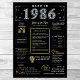 Revenez en 1986 avec notre affiche d'anniversaire numérique captivante, riche de faits historiques, d'événements importants et de récits captivants du passé. Avec ses élégantes touches d'or et d'argent sur fond noir, cette affiche exhale un charme intemporel. Qu'il soit présenté fièrement lors de rassemblements d'anniversaire ou tenu à l'honneur comme un gardien, il promet d'allumer des discussions animées et d'évoquer des souvenirs chéris. Notre affiche d'anniversaire offre un aperçu intrigant de 1986, explorant des facettes telles que le revenu moyen, les inventions notables, les événements importants, les tendances de la mode et les expressions familières de l'époque. Il met en lumière des moments clés comme l'effondrement de l'Union soviétique, le retour de la comète de Halley et la montée du breakdance. Des inventions majeures telles que les ordinateurs personnels, les CD et les coeurs artificiels sont présentées, reflétant les progrès technologiques remarquables de l'époque. Dans l'ensemble, l'affiche de l'anniversaire résume l'essence de la vie dans les années 1980, en saisissant à la fois l'innovation technologique et les phénomènes culturels tels que la musique et la mode. Il sert d'amorce de conversation intéressante pour les célébrations d'anniversaire et les anniversaires, et lorsqu'il est encadré avec goût, il devient un souvenir chéri, préservant l'esprit des temps pour les années à venir.