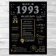 Revenez en 1993 avec notre affiche d'anniversaire numérique captivante, riche de faits historiques, d'événements importants et de récits enchanteurs du passé. Orné d'élégants accents dorés et argentés sur fond noir, ce poster d'anniversaire dégage un charme intemporel. Notre affiche d'anniversaire donne un aperçu fascinant de 1993, explorant des facettes telles que le revenu moyen, les inventions notables, les événements importants, les tendances de la mode et les expressions familières de l'époque. Il met en lumière des moments charniers comme la bulle Dot-Com, la montée des boys bands, l'émergence d'Internet par accès commuté, et l'inquiétude généralisée à propos de l'an 2000. D'importantes inventions telles que le World Wide Web, la messagerie texte, la technologie MP3 et l'appareil photo numérique sont mises en valeur, reflétant les progrès technologiques remarquables de l'époque. Dans l'ensemble, l'affiche de l'anniversaire résume l'essence de la vie dans les années 1990, en capturant à la fois l'innovation technologique et les phénomènes culturels comme la musique et la mode. Il sert d'amorce de conversation intéressante pour les célébrations d'anniversaire et les anniversaires, et lorsqu'il est élégamment encadré, il se transforme en un souvenir chéri, préservant l'esprit des temps pour les générations à venir.