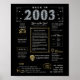 Revenez à 2003 avec notre affiche d'anniversaire numérique captivante, qui regorge de faits historiques, d'événements importants et de récits captivants du passé. Ornée d'élégants accents dorés et argentés sur fond noir, cette affiche d'anniversaire dégage un charme intemporel. Notre affiche d'anniversaire offre un aperçu intrigant en 2003, se penchant sur des aspects tels que le revenu moyen, les inventions notables, les événements importants, les tendances de la mode et les expressions familières de l'époque. Il met en lumière des moments clés comme l'avènement des plateformes de médias sociaux, l'explosion de la télé-réalité, et l'émergence de services de streaming. Des inventions telles que les smartphones, les téléphones portables et les voitures hybrides occupent le devant de la scène, reflétant les progrès technologiques remarquables de l'époque. Dans l'ensemble, l'affiche d'anniversaire saisit l'essence de la vie dans les années 2000, englobant à la fois l'innovation technologique et des phénomènes culturels comme la musique et la mode. Il sert de point de départ captivant pour les célébrations d'anniversaire et les anniversaires, et lorsqu'il est élégamment encadré, il évolue en un souvenir chéri, préservant l'esprit des temps pour les générations à venir.