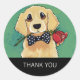 Mignons stickers Merci avec une peinture originale de Lisa Marie Robinson. Design présente un mignon chien de repérage doré tenant une rose rouge dans la bouche contre un arrière - plan vert. Les mots "Merci" peuvent être changés. Copyright © 2010 Lisa Marie Robinson Tous droits réservés. Il est illégal d'utiliser ou de dupliquer ceci, ou l'une de nos images, sans autorisation écrite.