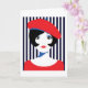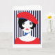 Retro Vintages Portrait von schicken jungen Franzosen aus den 1960er Jahren in einem roten, runden Nackenspringer und -beret auf dunkelblau und weiß senkrechten Streifen Hintergrund.
