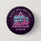 Achtzigerjahre Partyknopf, der eine retro Arttypographie von 'Achtzigerjahre Party" kennzeichnet. Entwürfe umfassen Elemente von dunklem Lila, Blues und Rosa, futuristische Elemente ScifI vom 80er, Dreieck und Gitter. Fertigen Sie mit Ereignis und Datum besonders an.