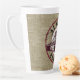 Die klassische, hohe Latte Tasse mit Imitaten, die im Hintergrund platziert sind, mit der Briefmarke der Alabama-Mobilbrücke in der Silhouette.