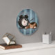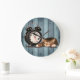 Cute tabby kitty sleeping next to big retro alarm clock with vintage blue stripes in the background. Painted by artist Maryline Cazenave.