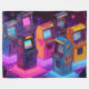 A group of vintage arcade machines stands illuminated by vibrant neon lights. The scene is set against a backdrop of a starry galaxy, creating a nostalgic yet futuristic atmosphere.