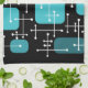Ein abstraktes Kunstmuster im Retro-Stil aus der Mitte des Jahrhunderts mit abgerundeten Quadraten und Rechtecken. Die Farbtöne sind aquamarin, türkisfarben und das Aquamarin ist leicht, schwarz.