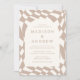 Das Retro Beige Checkerboard Foto lädt Sie ein, Ihren besonderen Tag zu feiern. Die Einladung zeigt Ihre Namen und Hochzeitsdetails in der Wüste sandfarben Buchstaben umgeben von einem hellen cremefarbenen Bogen Rahmen. Im Hintergrund befindet sich ein abstraktes Schachbrettmuster mit Wüstensand und cremefarbenem Rahmen. Die Einladung kehrt sich um, um Ihr vollblütiges vertikales Verlobung-Foto anzuzeigen.