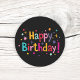 This circular sticker features a bold black background that makes the multi-colored "Happy Birthday!" greeting truly stand out. The design is decorated with a playful array of scattered stars and round confetti dots in vibrant shades of teal, pink, orange, and yellow. This color combination creates a nostalgic, retro party look that feels both fun and energetic. Because the background is dark, the bright festive shapes appear to glow, giving the labels a unique and eye-catching appearance. These simple yet stylish stickers are a perfect choice for anyone looking to add a classic, celebratory touch to gift wrap, envelopes, or party decorations.