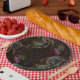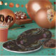 Atomische Wirbel, Raumzeit im 50er, modernes Retromuster Mitte des Jahrhunderts. Schwarz mit lila, blauen, gelben Wirbel.