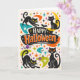 A bold, playful Halloween illustration bursting with mid-century modern charm. Four stylized black cats strike mischievous poses around a dramatic “Happy Halloween” banner, their bright eyes glowing in yellow, orange, and purple. The composition is energized by atomic-age starbursts, crescent moons, dots, and swooping shapes in a lively palette of teal, chartreuse, orange, violet, and black. With its clean style, whimsical motion, and retro-futuristic flair, this design feels fun, festive, and delightfully kitschy.