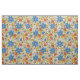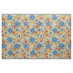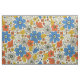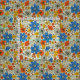 Dieser Stoff hat ein Retro-Blumenmuster, das Blume und Blätter in Orange-, Blau- und Gelbtönen zeigt.