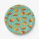 Käseseburger im Retro-Stil und französisches Pommes-Muster mit kleinen weißen Herzen auf einer blauen Papiertüte.