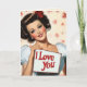 Eine lebendige Illustration im klassischen Button-Up-Stil der 1950er Jahre. Das Bild zeigt eine glamouröse Frau mit Vintagen Vorgängen, kühlem Make-up und einem strahlenden Lächeln. Sie hat ein Zeichen mit einer liebevollen Botschaft, "I Liebe You", Set vor einem Hintergrund von zarten rosa Rosen. Die Gesamtästhetik erfasst das romantische und spielerische Ambiente der mittelalterlichen Button-Up-Kunst.