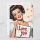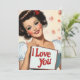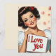 Eine lebendige Illustration im klassischen Button-Up-Stil der 1950er Jahre. Das Bild zeigt eine glamouröse Frau mit Vintagen Vorgängen, kühlem Make-up und einem strahlenden Lächeln. Sie hat ein Zeichen mit einer liebevollen Botschaft, "I Liebe You", Set vor einem Hintergrund von zarten rosa Rosen. Die Gesamtästhetik erfasst das romantische und spielerische Ambiente der mittelalterlichen Button-Up-Kunst.