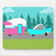 Dieser Retro Camper/Anhänger und Auto Mousepad kennzeichnet eine moderne Mitte des Jahrhunderts, unbedeutendes Cartoonzeichnen, das Sie verlässt vorzubereiten, um zur offenen Straße zu nehmen. Eine Ehrerbietung zu den fünfziger Jahren, dieses Ausrüstungsbeschreibungen ein Vintages Türkisauto mit der weißen Spitze, einen kitschy Reiseanhänger zu seinem abschließenden Bestimmungsort ziehend. Der tadellos wieder hergestellte, Retro RV hat eine Pink, weiße Spitzenhälfte der unteren hälfte und einen Türkisblitzbolzen, der die zwei trennt. Die Tür in der Seite des Campers ist auch Türkis. Der abschließende Akzent ist der Flügel des heißen Rosas, der von der Rückseite dieses Zuhause auf Rädern hervorsteht. Die glücklichen Menschen fahren hinunter eine graue Straße. Die Fahrbahn wird durch Stoff, grünes Gras umgeben. Im Hintergrund können wir die aquamarinen Silhouetten eines wirklichen Waldes der Zedernbäume, gegen einen Aquahimmel mit den geschwollenen, hellblauen Wolken sehen. Dieser Entwurf ist für jeder von pensioniertem Hippies, von Vogel-Hipstern oder von jedermann perfekt, der will, um einige große Kindheits-Erinnerungen wieder zu erleben. Das beste Teil ist, dass niemand fragt, "sind wir dort schon?"