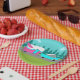 Diese Retro Camper / Trailer und Autopapier Teller verfügen über einen modernen, minimalistischen Cartoon, der Ihnen verlasse, sich auf die offene Straße zu begeben. Dieses Design ist eine Hommage an die 1950er Jahre und bietet ein Vintages türkisfarbenes Auto mit weißem Oberteil, das einen kitschigen Trailer zu seinem Endziel zieht. Der perfekt restaurierte Retro RV hat eine heiß rosa Unterhälfte, eine weiße obere Hälfte und einen türkisfarbenen Blitz, der beide trennt. Die Tür an der Seite des Campers ist ebenfalls türkis. Der letzte Akzent ist der heiß rosa Flügel, der von der Rückseite dieser Zuhause auf Rädern hervorragt. Die glücklichen Camper fahren eine graue Straße hinunter. Die Straße ist von üppigem, grünem Gras umgeben. Im Hintergrund können wir die aquamarinen Silhouetten eines echten Zedernwaldes sehen, vor einem Aquahain mit puffigen, hellblauen Wolken. Dieses Design ist perfekt für alle, von pensionierten Hippies, schwindenden Hipstern oder für alle, die will, einige großartige Erinnerungen aus der Kindheit zu erleben. Das Beste daran ist, dass niemand frage: "Sind wir noch da?"