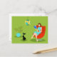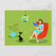 Cette rétro carte postale de femme de lecture comporte un style des années 1960, art minimaliste, dessin de bande dessinée d'une femme qui a ses priorités dans l'ordre. Ce rat de bibliothèque délicieux est ravi dans vrai page-Turner. La brune bien faite porte une robe d'aqua et des lunettes rouges, tout en tenant un livre bleu. Elle est assise dans une chaise confortable et rouge d'oeufs. Devant elle, un chat lisse et noir dans un collier de sarcelle d'hiver apprécie la paix et la tranquillité qui vient de la vie avec un bibliophile. La femme et le chat sont dans une salle verte élégante. Aérien, il y a une lampe pendante kitschy aux nuances du jaune et de la turquoise. Au côté, il y a un ivrogne, plante tropical et mis en pot dans un pot de fleurs d'aqua. Kitty, si vous avez besoin de quelque chose, vous devrez attendre jusqu'à ce qu'elle finisse ce chapitre !