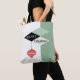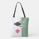 Eine stilvolle Retro-schicke Tote-Tasche für die Weihnachtszeit in einem modernen Design Mitte des Jahrhunderts, das geometrische Diamantformen mit fröhlichem Weihnachtstext hat. Ein Weihnachtsschmuck in leuchtendem Korallenrot hängt vom diamantenförmigen Muster. Der Hintergrund enthält ein Farbblock-Design von Weiß und Grün. Freuen Sie sich auf Urlaubsjubeln im Einkaufszentrum, im Supermarkt, bei der Arbeit oder in der Schule und überall, wo Sie während der Ferienzeit hingehen.
