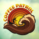 Kaffeepatrol. Surfen Sie mit einer Tasse Kaffee und reiten Sie eine Kaffeewelle mit einem Sonnenuntergang im Hintergrund. Retro 70er bedrückte Stil.
