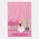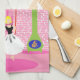 Cette serviette de cuisine rétro In the Pink ressemble à une scène d'une comédie romantique des années 60. Le design minimaliste montre une femme sophistiquée dans son appartement de grand standing ultra kitsch et ultra rose. La chambre est ornée d'un mur en briques roses avec des lignes de gris blanc. Devant le mur, une cheminée verte à cônes avec un feu de cheminée. A travers des portes coulissantes en verre, nous voyons un balcon rose avec une balustrade blanche. Un plante tropical luxuriant se trouve dans un aqua fleuri. Depuis le balcon, la vue donne sur la silhouette d'un grand horizon urbain. Bien sûr, la silhouette est rose ! Une lune jaune croissant est dans le ciel. Posé sur un rosé chaud, le tapis de shag dans l'appartement est la principale dame de ce design. En contraste saisissant avec le monde rose qu'elle a créé, la belle blonde porte une robe de forme noire à cou boule avec une longue jupe blanche flardée et ornée de plumes noires. Avec ce design, vous pouvez aussi regarder le monde à travers des lunettes de couleur rose !