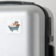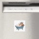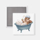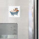 Retro Eichhörnchen Baby Duschmagnet. Das Eichhörnchen aus Cartoon mit Duschhaube ist in einer Retro-Badewanne untergebracht, umgeben von Blasen, und tut so, als wäre es eine Berühmtheit im Urlaub.
