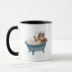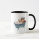 Retro Eichhörnchen Baby Dusche Tasse. Das Eichhörnchen aus Cartoon mit Duschhaube ist in einer Retro-Badewanne untergebracht, umgeben von Blasen, und tut so, als wäre es eine Berühmtheit im Urlaub.