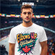 Ein gewagtes, im Retro-inspiriert T - Shirt-Design mit der Phrase "Elbows Up" in einem feinen, 70er-Stil Blase-Schriftart mit einem leichten Bogen, gestapelt über "Attitude First" in einer ergänzenden, leicht kondensierten Vintagen Schrift. Der Text sollte einen lebendigen, bunten Verlauf haben, der warme Sonnenuntergangsfarben (Orange, Rosa, Gelb) mit einer fett dunklen Kontur für Kontrast verbindet. Um den Text zu umgeben, fügen Sie dynamische Wellenlinien, abstrakte Stöße oder Blitzschrauben in aquamarin, lila und rot ein, um Energie und Bewegung zu erhöhen. Denken Sie daran, subtile, bedrückte Texturen oder eine halftone Schattierung hinzuzufügen, um ihm ein abgenutztes, Vintages Gefühl zu geben. Das Gesamtbild sollte spielerisch, zuversichtlich und voller Retro-Einstellung sein - perfekt um eine Aussage zu machen!