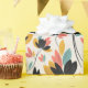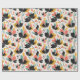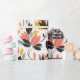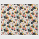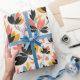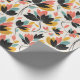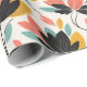 Ein buntes Geschenkpapier, entworfen in Retro-Farben wie Schwarz, Türkis, Gold und Orange, in einem floralen Blattdesign