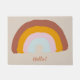Erstelle eine Begrüßungsmatte mit einigen guten Schwingungen. Diese Türmatte zeigt eine handgezeichnet doodle-artige Abbildung eines Regenbogens in mellow, Retrofarben Rostrot, goldfarben Orange, blassrosa und hellblau. Es ist bereit, mit einem Namen personalisiert zu werden oder mit Ihrer eigenen Botschaft individuell zu gestalten.