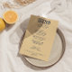 Ein buntes Retro funky modernes helles Abendmenü. Das Design der schicken Vorlage boho Vintag peach gelben Hintergrund und oxford blauen Typografie und handgeschriebenen Menü in blau . Und heller, grüner Hintergrund. Perfekt und passend zu der ganzen Suite.
