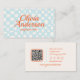 Wenn Sie eine perfekte und einzigartige Visitenkarte suchen, ist diese für Sie!! Ein einzigartiges und Retro-böhmisch-chic rosafarbenes trendiges, helles, feines Visitenkarten-Template. Da es sich um einen schlichten, hellen Hintergrund mit elegantem, einzigartigem orangefarbenem Script-Schriftart und hellblau in der Hand gezeichnetem Schachbrett handelt. Mit Vintag handgeschriebenem Titel oder Berufsvorlage. Und hinten haben wir die handgezeichneten Social-Media-Icons mit anderen Infos als Website und Kontaktinformationen und personalisierbaren QR-Code. Sie können es einfach und einfach anpassen, indem Sie in der blauen Schaltfläche Personalisieren klicken und dann die Informationen ändern. Wofür du gewartet hast!! Greifen Sie und wir garantieren Ihnen die phantastische Qualität und den schnellen Versand.
