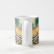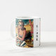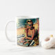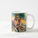 Personalisierte Kaffeetasse. Retro Pop Kunstfrau in Sonnenbrille am Strand liest eine Mode-Zeitschrift.