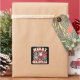 "Frohe Weihnachten" Retro-Stil der 70er Jahre mit Weihnachtsmann und glücklichen Weihnachtsbaum, plus Geschenke! Schwarzer Hintergrund mit Karo Hintergrund und Schneedeckenrand. Dieses Design bekommt wirklich die 70er Jahre Urlaubsvibes. Ideal für Post- oder Geschenkpakete.