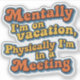 This vintage-style funny quote design says it all: “Mentally I’m on vacation, physically I’m in a meeting.” With bold retro typography in warm orange and yellow hues, outlined in blue for extra pop, this design captures the sarcastic exhaustion of modern life. Perfect for anyone surviving meetings with daydreams of beach getaways! Ideal for office humor merch, burnout culture gifts, or a funny sticker on your laptop to let the world know where your mind really is.
