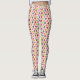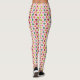 These festive leggings feature a festive pattern inspired by classic 1970s Christmas designs. The simple geometric print of circles and vertical stripes is in green, red, orange, pink and lime green against a white background.