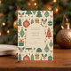Stilvolle Urlaubswünsche mit dieser modernen Retrokarte in Grün und Rot Mitte des Jahrhunderts. Mit hübschen und eleganten geometrischen Formen, funky abstrakter Sternexplosion, Vintag inspiriert Typografie, Kiefern, Kiefern und Beeren, Schneeflocken und einem charmanten Zierakzent verleiht dieses Design Ihren Wintergruben einen zeitlosen Stil.