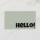 Machen Sie Ihr Geschäft einfach lustig und sauber elegant. Ein minimalistisch neutraler Pistazien Salbei Grün Retro Groovy Hallo einzigartiges VisitenkartenTemplate . Wie Sie sehen, zeigt es Flugzeug blassgrünen Hintergrund. Und schwarz elegante Groovy Schriftart von hello in der Vorderseite. Und hinten haben Sie den vollen Namen und Titel .Und Social Media Icons und benutzerdefinierten QR Code mit anderen Infos. Sie können es einfach anpassen, indem Sie in der blauen Schaltfläche Personalisieren klicken und dann die Informationen ändern. Wofür du gewartet hast!! Wir garantieren Ihnen die phantastische Qualität und den schnellen Versand.