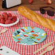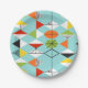 Dieser Retro Harlekin-Muster-Papier-Teller ist moderne Art der Mitte des Jahrhunderts an seinem feinsten. Die Vintagen inspirierten Ausrüstungsbeschreibungen, die ein Aquahintergrund mit Reihen der dreieckigen Formen, die einen Harlekin bilden, kopieren. Die zwei-getonten Diamantformen sind gelb, weiß, rot, orange, schwarz, grün und Weiß mit schwarzen Akzenten. Aber Wartezeit, dort ist mehr! Es gibt auch orange Ovale, grüne Ovale mit schwarzen Sternexplosionen und Konturen der schwarzen Diamanten. Setzen Sie Zeit März an fest, aber Sie glauben, wie Sie eine kitschy Explosion von der Vergangenheit mit diesem bunten geometrischen Schatz gefunden haben.