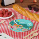 Dieses Retro homosexuelle Pool-Party-PapierplattenAusrüstungsbeschreibungen vier hunky Beefcakes, die eine homosexuelle alte Zeit haben, wie sie die Palm- Springhitze schlugen, indem sie herum das blaue Wasser des Türkises ihres Atombumerang geformten Swimmingpools lounging. Die moderne Architektur der Mitte des Jahrhunderts auf dem fabelhaften, orange Steinhaus ist offenbar das wirkliche HauptAnwesen, die Ansicht der Berge im Hintergrund gegeben. Eine gelbe Sternexplosionsonne scheint hell im Türkishimmel, also sind Sie in der Lage, jedes reizend Detail zu sehen--von den kitschy, rosa Flamingos zu den fünfziger Jahren striped, windiger Blockzaun. Und selbstverständlich würde welches Palm Springs-Haus ohne eine Palme komplett sein?